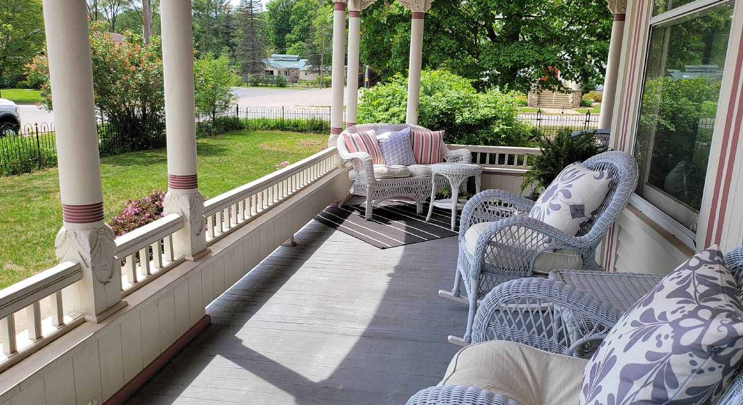 Spacious outside front porch with grey wicker furniture overlooking lawn and street